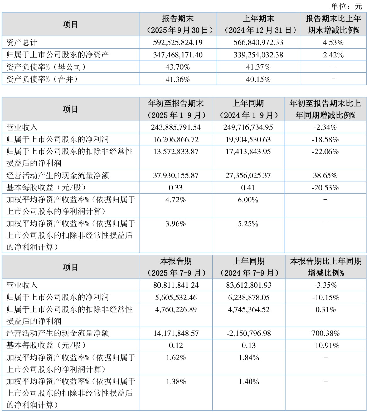 负债重大变化方面,截至2025年三季度末,公司短期借款较上年末增加38.67%,占公司总资产比重上升3.57个百分点;应付票据及应付账款较上年末减少4.68%,占公司总资产比重下降1.29个百分点;长期递延收益较上年末减少4.19%,占公司总资产比重下降0.92个百分点;合同负债较上年末增加29.23%,占公司总资产比重上升0.19个百分点。
