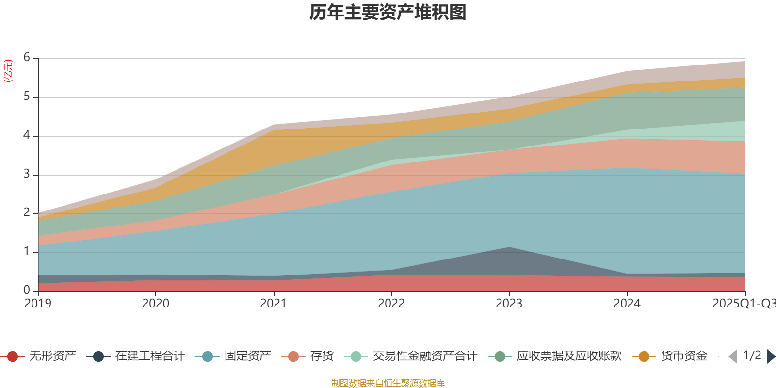 资产重大变化方面,截至2025年三季度末,公司交易性金融资产合计较上年末增加137.03%,占公司总资产比重上升4.97个百分点;固定资产较上年末减少6.17%,占公司总资产比重下降4.93个百分点;应收票据及应收账款较上年末减少10.47%,占公司总资产比重下降2.43个百分点;其他非流动资产较上年末增加94.9%,占公司总资产比重上升1.05个百分点。