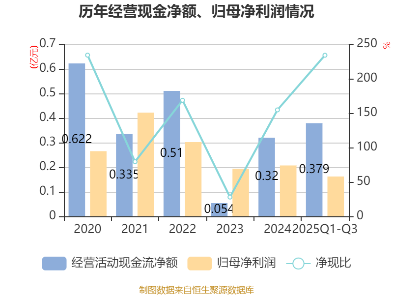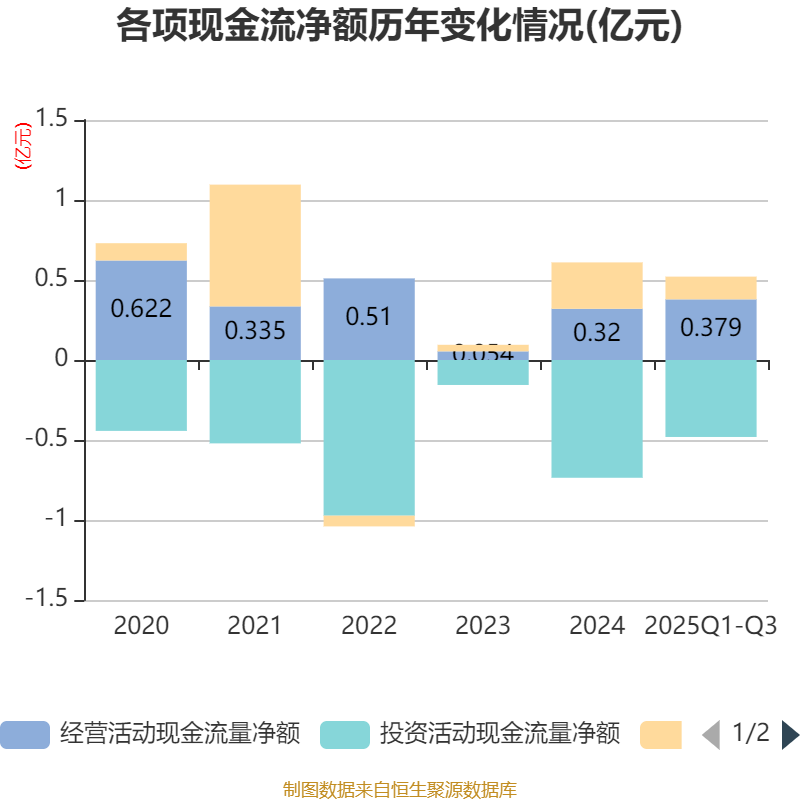 2025年前三季度,公司经营活动现金流净额为3793.02万元,同比增长38.65%;筹资活动现金流净额1418.21万元,同比减少1527.05万元;投资活动现金流净额-4813.7万元,上年同期为-5509.66万元。