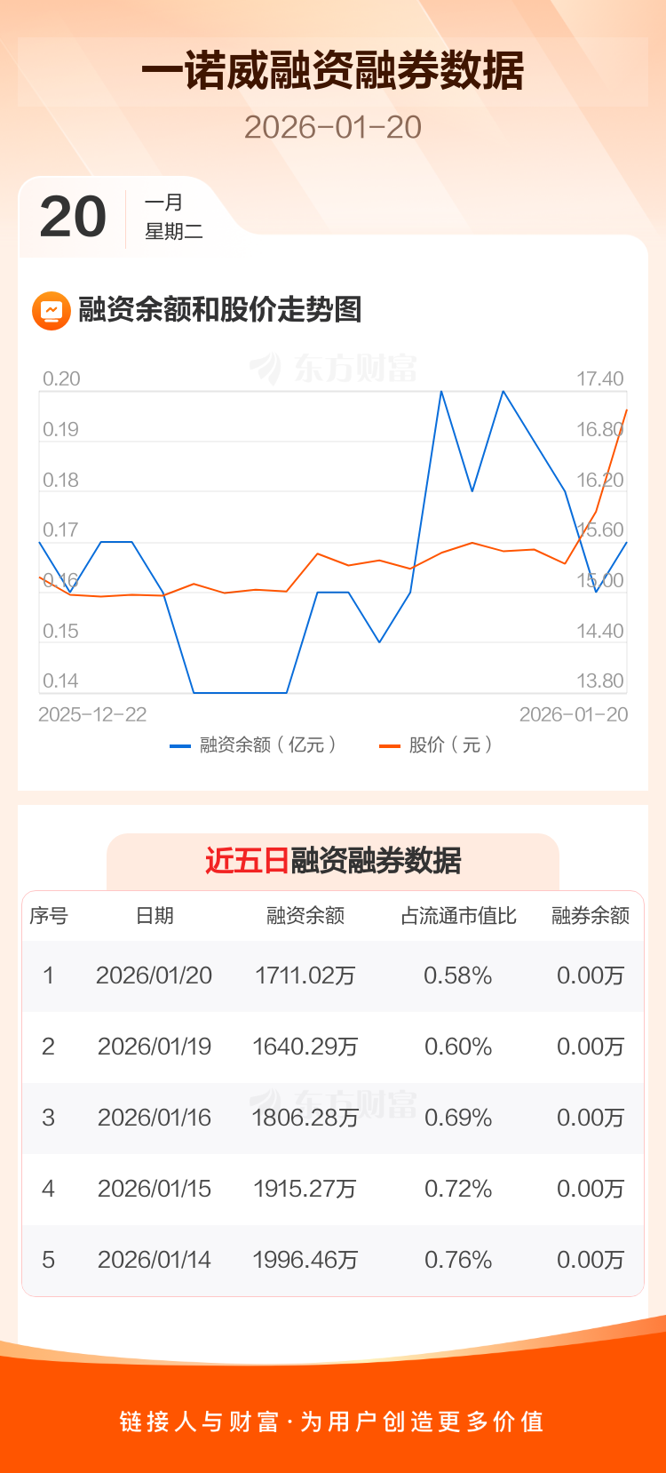 交易所最新数据显示,一诺威于2026年1月20日获融资买入821.05万元,融资偿还750.31万元,当日融资净买入70.73万元。目前,该股融资余额1711.02万,占流通市值比例为0.58%。