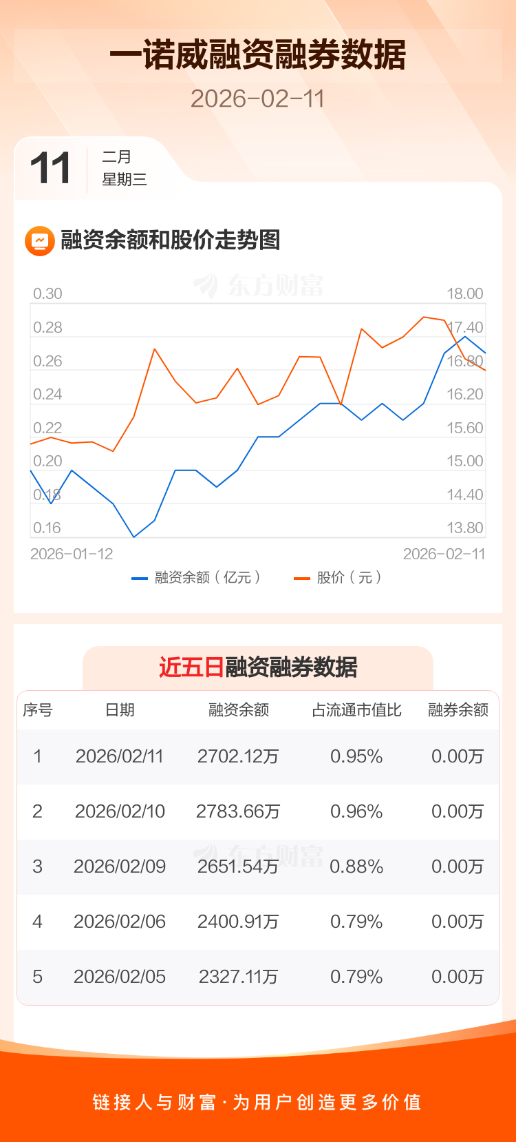交易所最新数据显示,一诺威于2026年2月11日获融资买入176.00万元,融资偿还257.54万元,当日融资净偿还81.54万元。目前,该股融资余额2702.12万,占流通市值比例为0.95%。