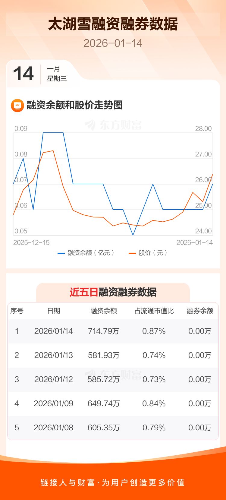 交易所最新数据显示,太湖雪于2026年1月14日获融资买入249.09万元,融资偿还116.23万元,当日融资净买入132.87万元。目前,该股融资余额714.79万,占流通市值比例为0.87%。