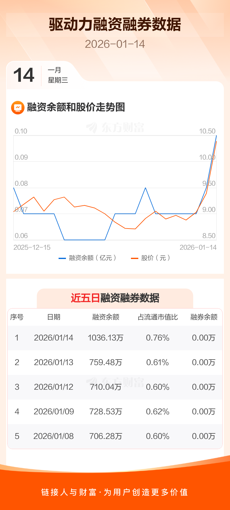 交易所最新数据显示,驱动力于2026年1月14日获融资买入464.95万元,融资偿还188.31万元,当日融资净买入276.64万元。目前,该股融资余额1036.13万,占流通市值比例为0.76%。
