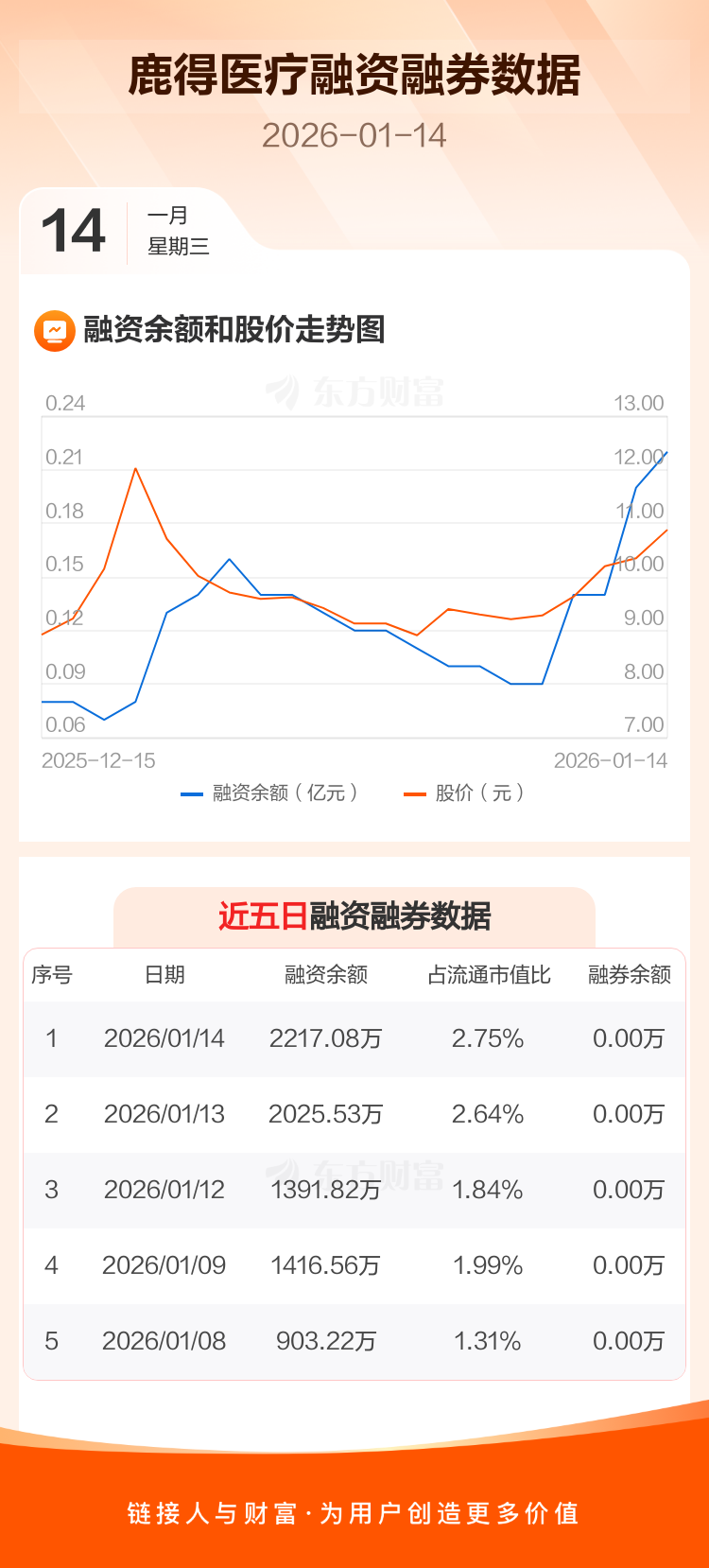 交易所最新数据显示,鹿得医疗于2026年1月14日获融资买入1509.16万元,融资偿还1317.61万元,当日融资净买入191.54万元。目前,该股融资余额2217.08万,占流通市值比例为2.75%。