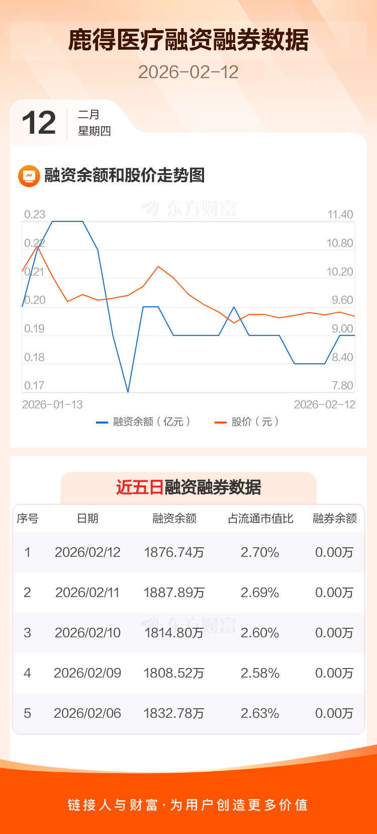 交易所最新数据显示,鹿得医疗于2026年2月12日获融资买入4.19万元,融资偿还15.34万元,当日融资净偿还11.15万元。目前,该股融资余额1876.74万,占流通市值比例为2.70%。