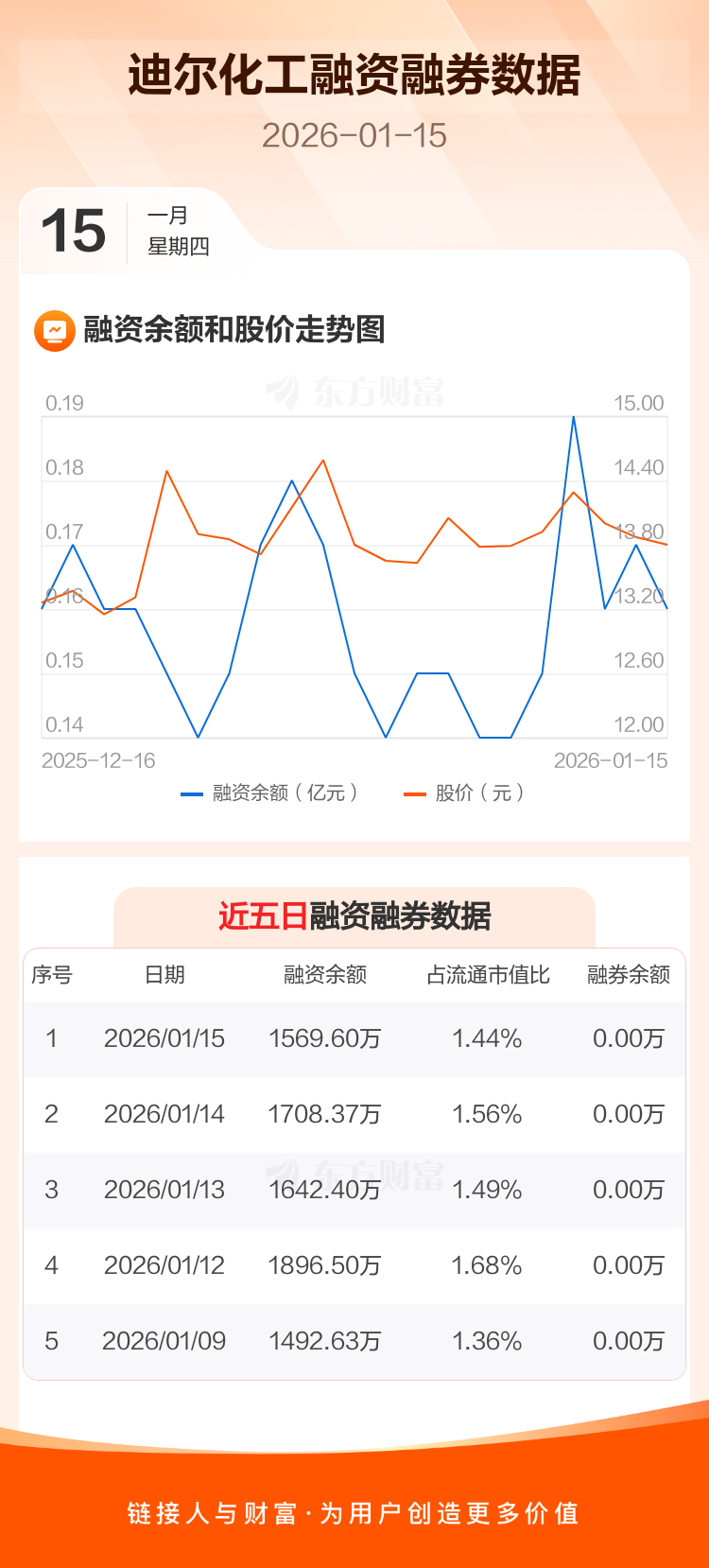 交易所最新数据显示,迪尔化工于2026年1月15日获融资买入284.36万元,融资偿还423.13万元,当日融资净偿还138.77万元。目前,该股融资余额1569.60万,占流通市值比例为1.44%。
