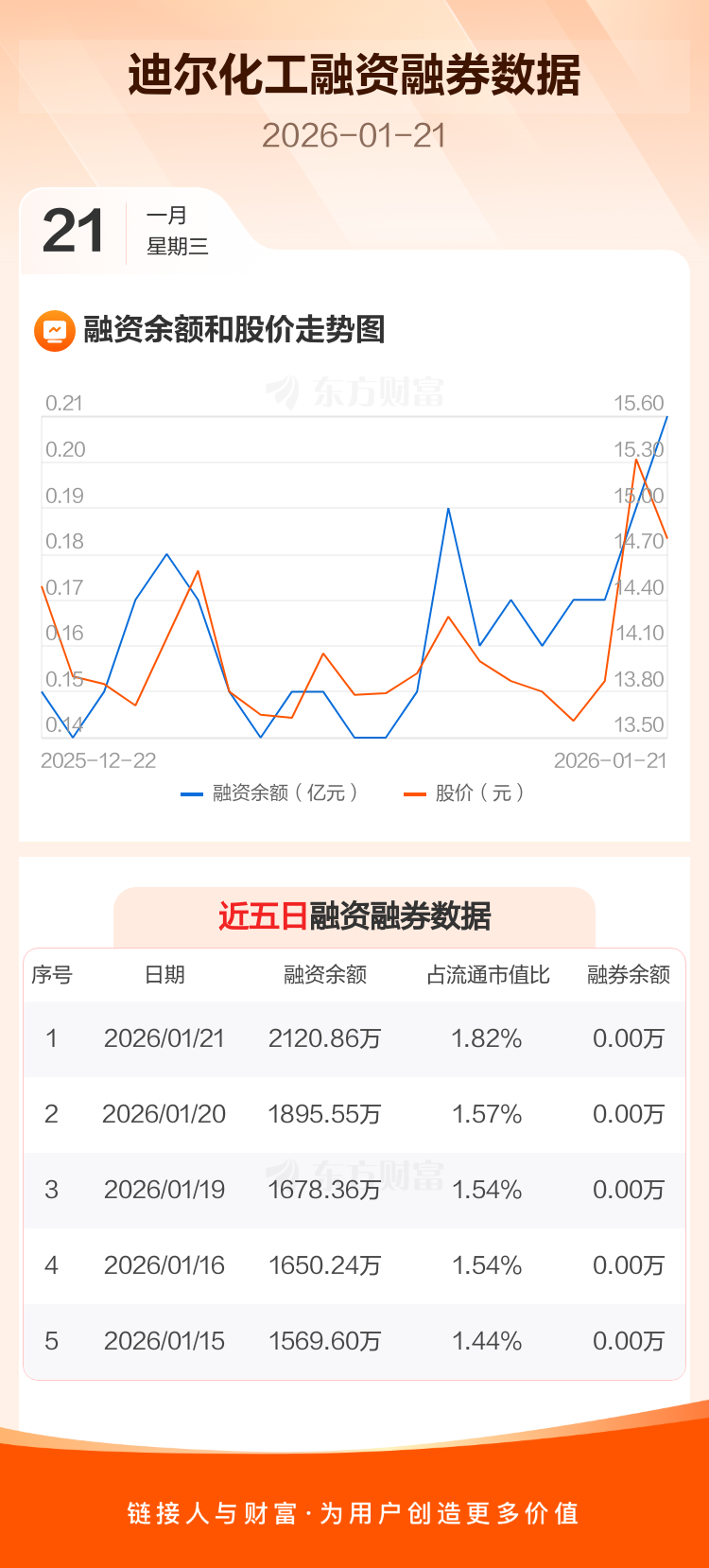 交易所最新数据显示,迪尔化工于2026年1月21日获融资买入917.88万元,融资偿还692.57万元,当日融资净买入225.32万元。目前,该股融资余额2120.87万,占流通市值比例为1.82%。