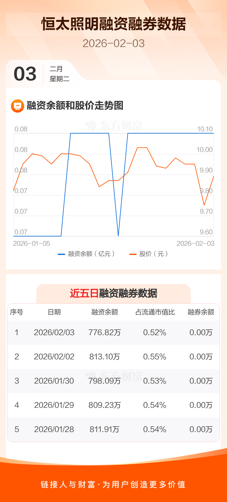 交易所最新数据显示,恒太照明于2026年2月3日获融资买入34.00万元,融资偿还70.29万元,当日融资净偿还36.29万元。目前,该股融资余额776.82万,占流通市值比例为0.52%。
