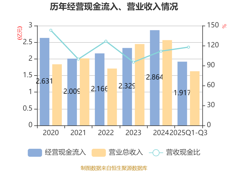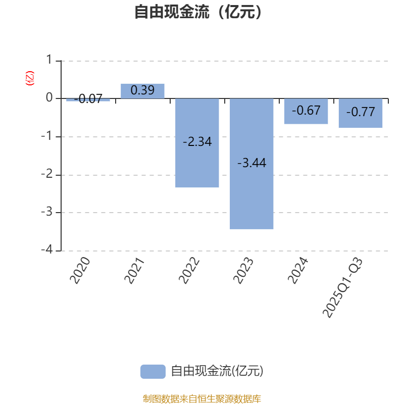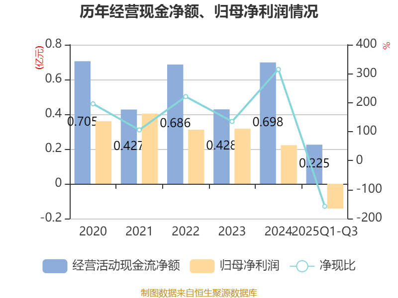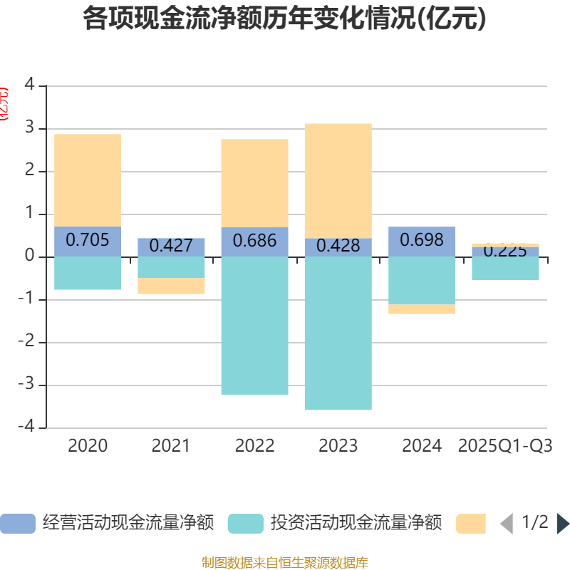 2025年前三季度,公司经营活动现金流净额为2251.83万元,同比下降60.45%;筹资活动现金流净额766.61万元,同比增加2030.47万元;投资活动现金流净额-5502.19万元,上年同期为-9683.8万元。