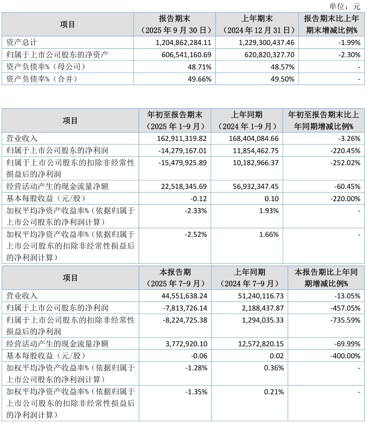 中证智能财讯三元基因(920344)10月29日披露2025年第三季度报告。前三季度公司实现营业总收入1.63亿元,同比下降3.26%;归母净利润亏损1427.92万元,上年同期盈利1185.45万元;扣非净利润亏损1547.99万元,上年同期盈利1018.3万元;经营活动产生的现金流量净额为2251.83万元,同比下降60.45%;报告期内,三元基因基本每股收益为-0.12元,加权平均净资产收益率为-2.33%。