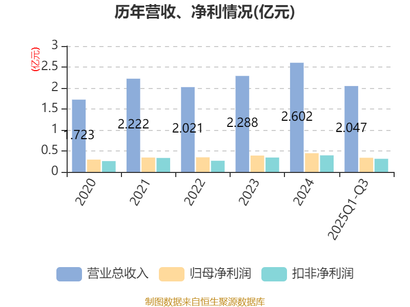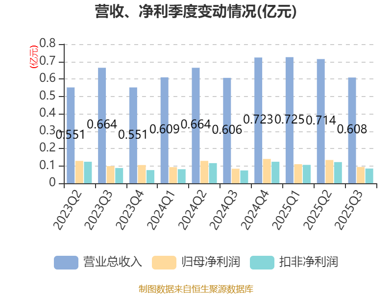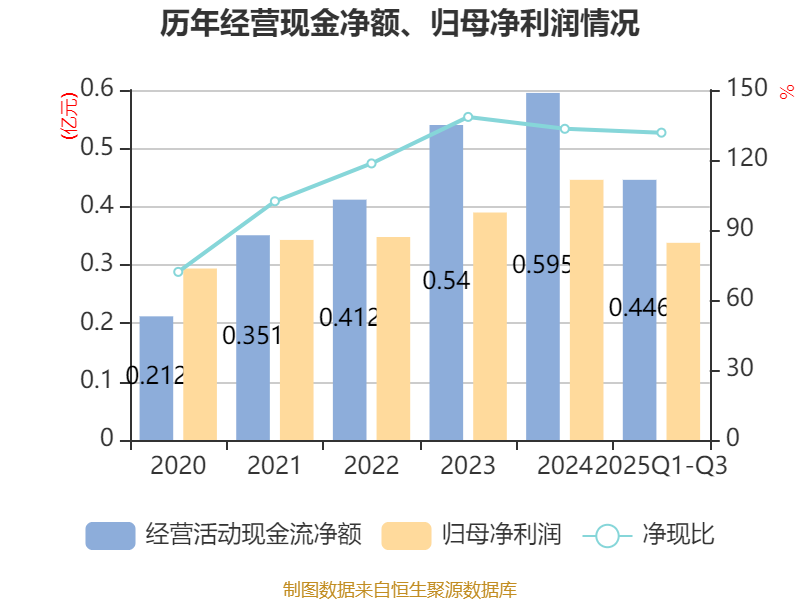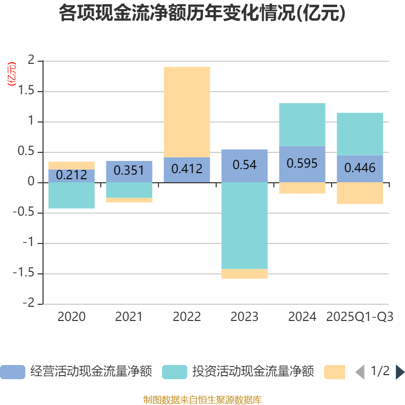 2025年前三季度,公司经营活动现金流净额为4455.77万元,同比增长13.23%;筹资活动现金流净额-3566.16万元,同比减少1728.74万元;投资活动现金流净额6974.25万元,上年同期为3732.54万元。