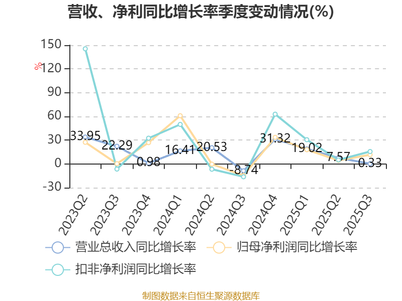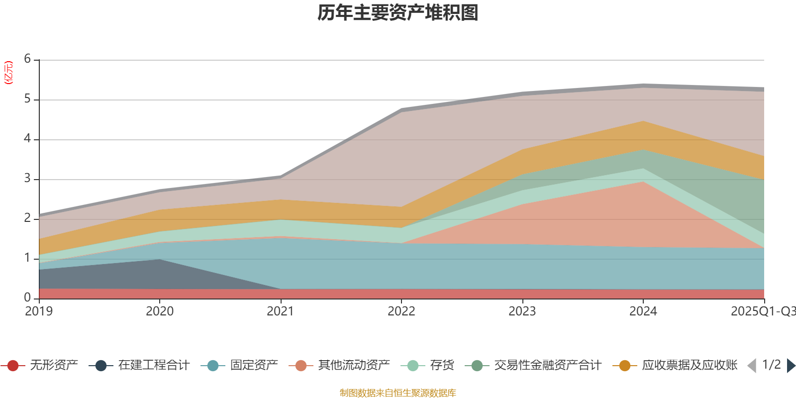 资产重大变化方面,截至2025年三季度末,公司其他流动资产较上年末减少99.54%,占公司总资产比重下降30.36个百分点;交易性金融资产合计较上年末增加186.73%,占公司总资产比重上升16.77个百分点;货币资金较上年末增加93.83%,占公司总资产比重上升15.02个百分点;应收票据及应收账款较上年末减少16.87%,占公司总资产比重下降2.05个百分点。