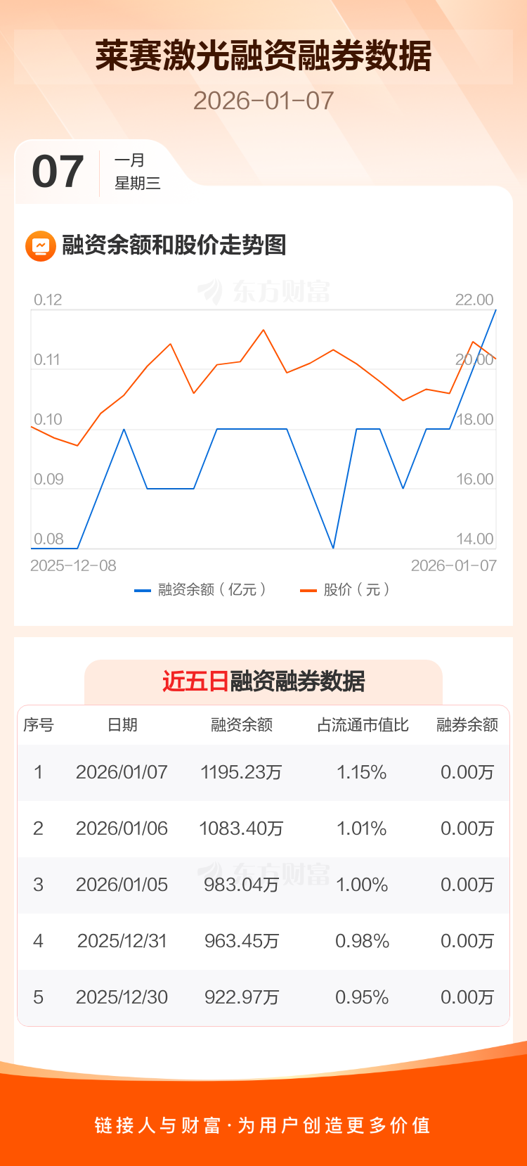交易所最新数据显示,莱赛激光于2026年1月7日获融资买入264.03万元,融资偿还152.20万元,当日融资净买入111.82万元。目前,该股融资余额1195.23万,占流通市值比例为1.15%。