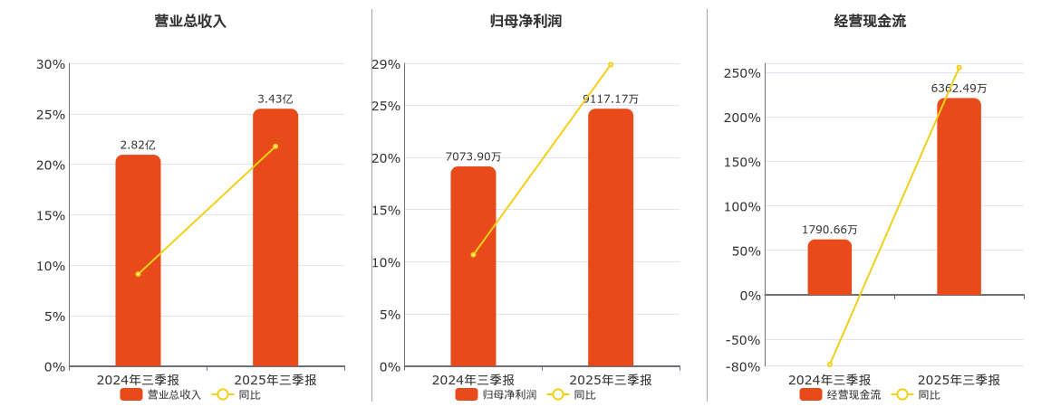 公司营业总收入为3.43亿元,较去年同报告期营业总收入增加6137.60万元,实现5年连续上涨,同比较去年同期上涨21.77%。归母净利润为9117.17万元,较去年同报告期归母净利润增加2043.27万元,实现5年连续上涨,同比较去年同期上涨28.88%。经营活动现金净流入为6362.49万元,较去年同报告期经营活动现金净流入增加4571.84万元,同比较去年同期上涨255.32%。