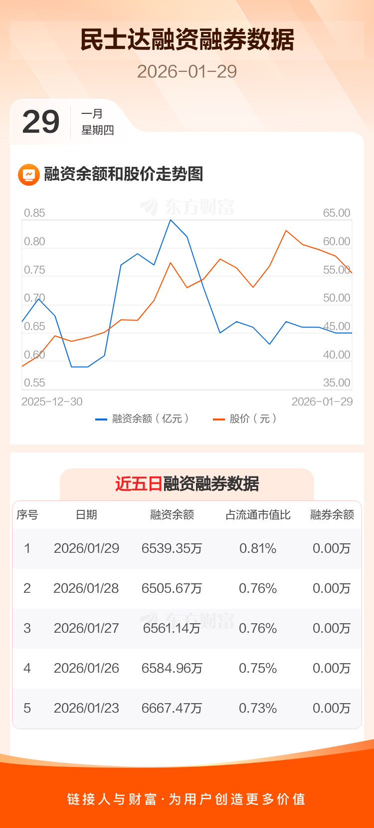 交易所最新数据显示,民士达于2026年1月29日获融资买入573.67万元,融资偿还539.98万元,当日融资净买入33.68万元。目前,该股融资余额6539.35万,占流通市值比例为0.81%。