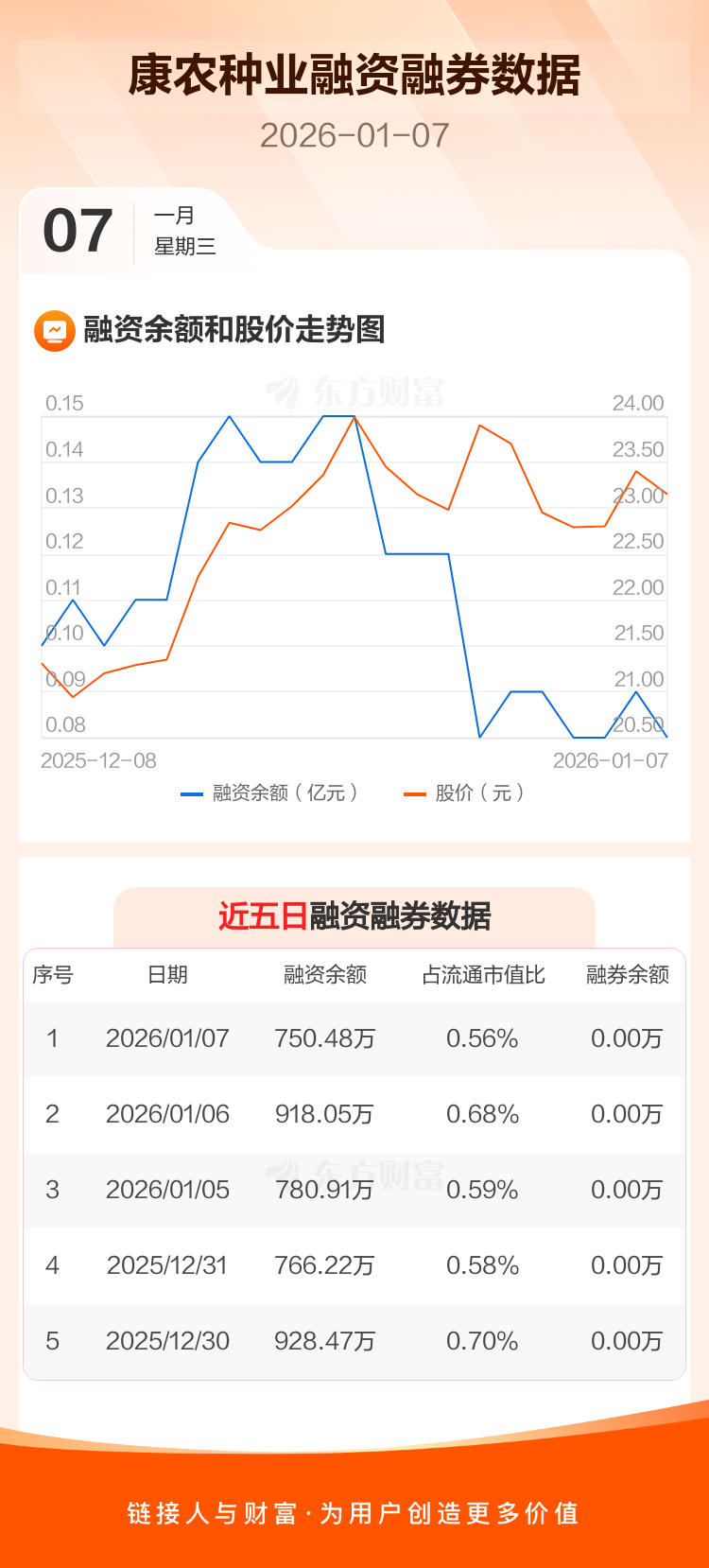 交易所最新数据显示,康农种业于2026年1月7日获融资买入159.11万元,融资偿还326.68万元,当日融资净偿还167.57万元。目前,该股融资余额750.48万,占流通市值比例为0.56%。
