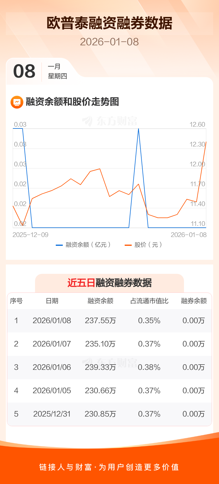 交易所最新数据显示,欧普泰于2026年1月8日获融资买入24.61万元,融资偿还22.16万元,当日融资净买入2.45万元。目前,该股融资余额237.55万,占流通市值比例为0.35%。