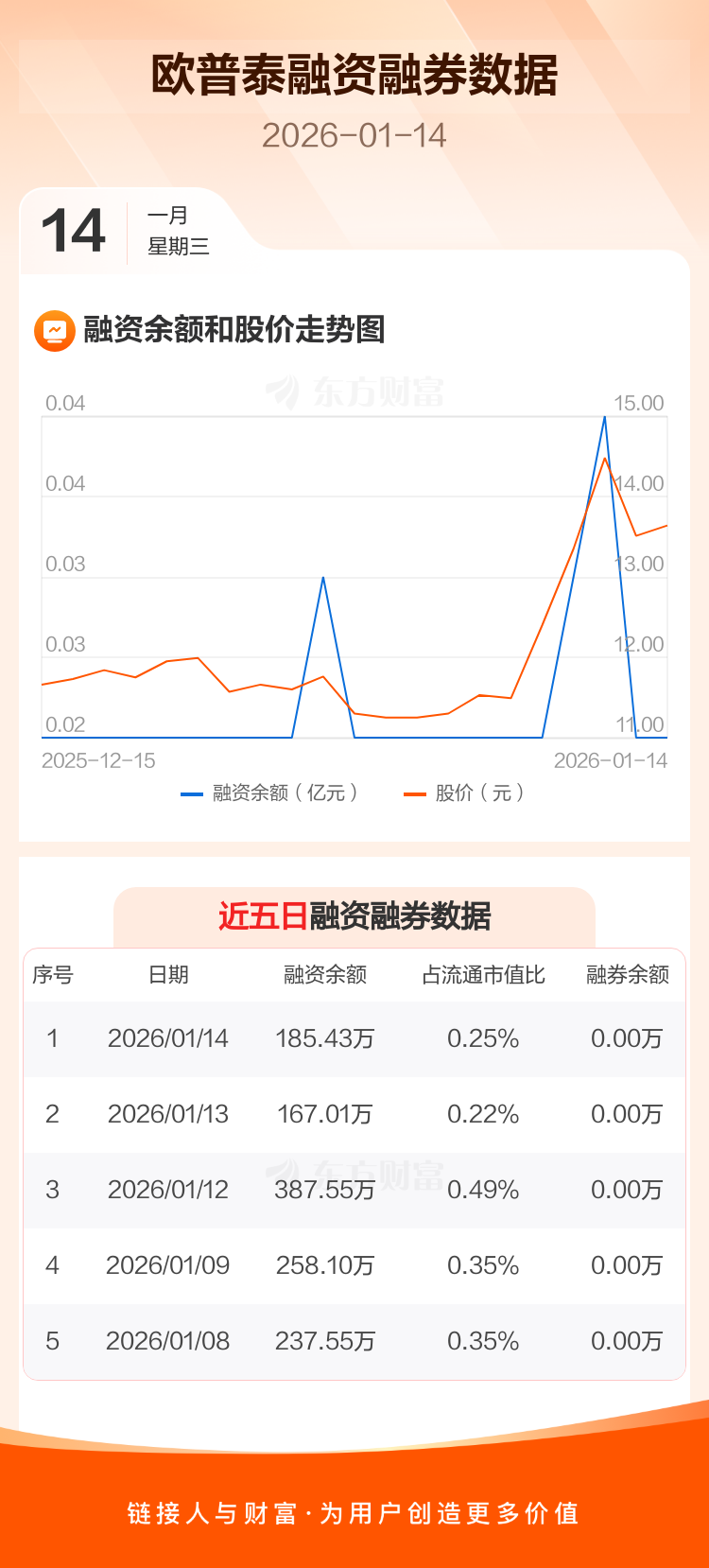 交易所最新数据显示,欧普泰于2026年1月14日获融资买入38.10万元,融资偿还19.69万元,当日融资净买入18.41万元。目前,该股融资余额185.43万,占流通市值比例为0.25%。