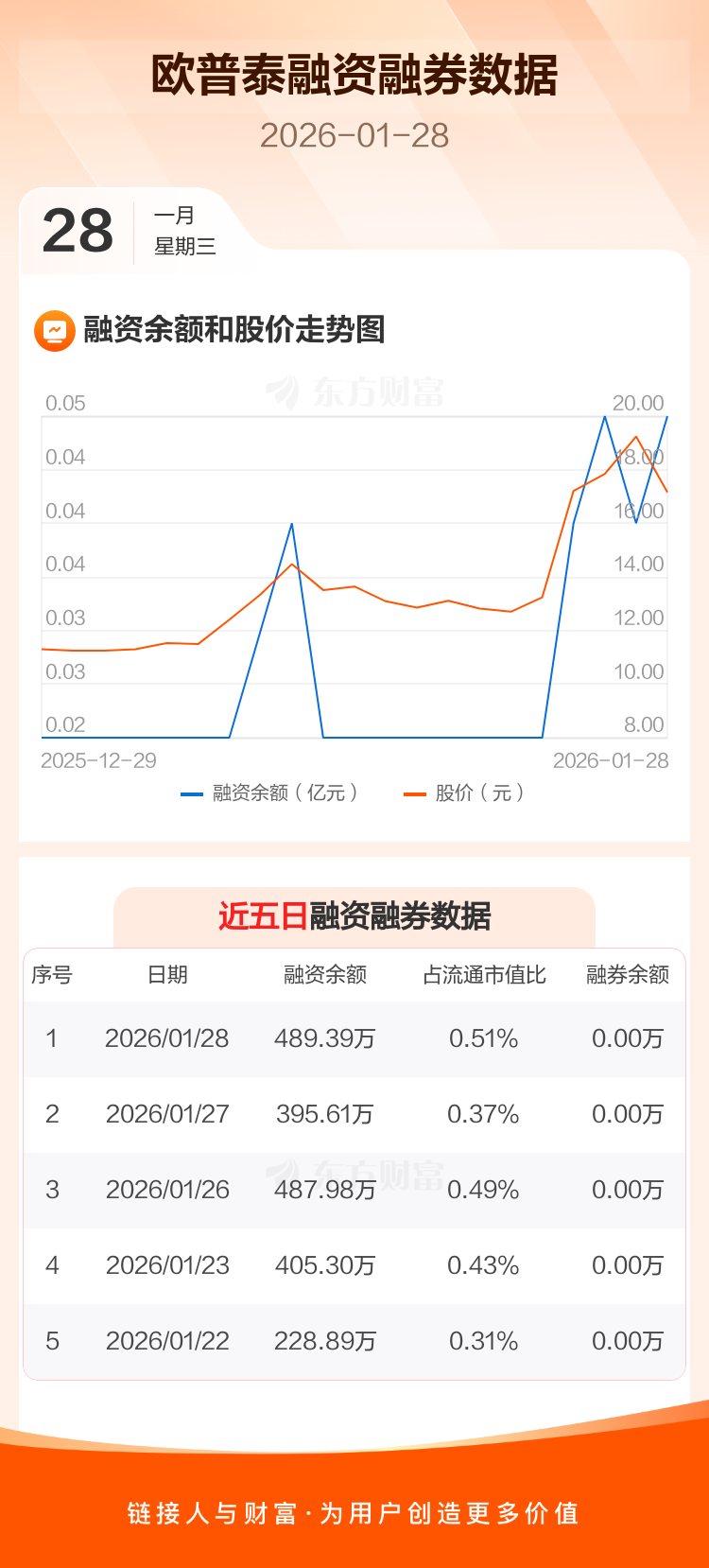 交易所最新数据显示,欧普泰于2026年1月28日获融资买入170.26万元,融资偿还76.48万元,当日融资净买入93.78万元。目前,该股融资余额489.39万,占流通市值比例为0.51%。