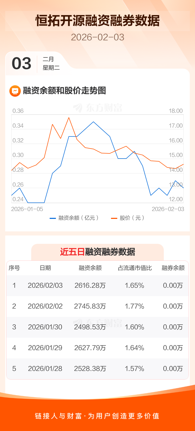 交易所最新数据显示,恒拓开源于2026年2月3日获融资买入117.54万元,融资偿还247.10万元,当日融资净偿还129.56万元。目前,该股融资余额2616.28万,占流通市值比例为1.65%。