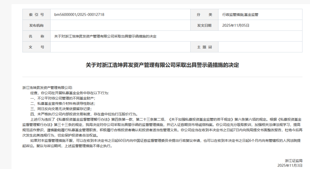 中国证券投资基金业协会公示信息显示,浩坤昇发成立于2016年6月,于2017年11月完成登记,目前管理规模在20亿元—50亿元区间。2025年11月,浙江证监局披露信息称,浙江浩坤昇发存在四类违规事实:一是不公平对待公司管理的不同基金财产;二是私募基金宣传推介材料有误导性陈述;三是同日反向交易无决策依据留存记录;四是未严格执行公司内部投资交易制度,存在盘中拉抬打压股价行为。
