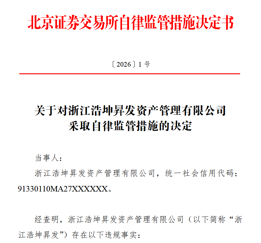 北交所指出,上述行为违反了“单个证券账户,或两个以上固定的或涉嫌关联的证券账户,大笔申报、连续申报、密集申报或申报价格明显偏离该证券行情揭示的最近成交价”的规定,因此对浩坤昇发名下相关证券账户采取限制证券账户交易的自律监管措施,并记入证券期货市场诚信档案。限制证券账户交易期为三个月,自2026年1月26日至2026年4月25日。