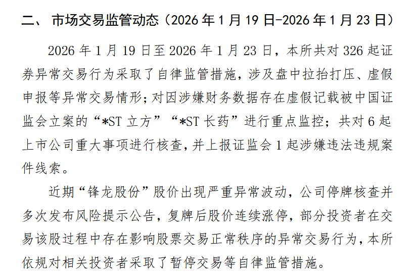 据深交所近日公示信息,1月19日至1月23日,该交易所共对326起证券异常交易行为采取了自律监管措施,涉及盘中拉抬打压、虚假申报等异常交易情形。