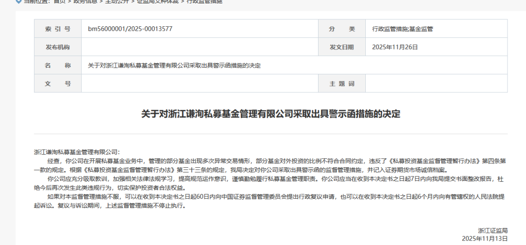 2025年11月,浙江证监局也发布了行政监管措施决定书,剑指浙江谦洵私募基金管理有限公司。