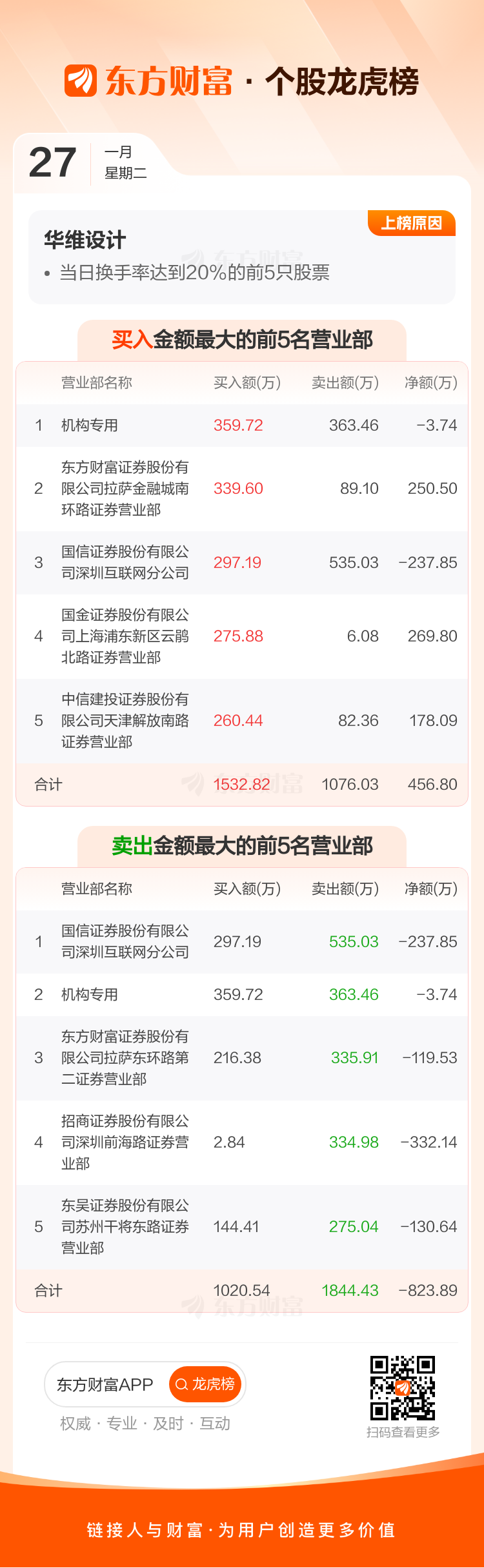 交易所2026年1月27日公布的交易公开信息显示,华维设计因成为当日换手率达到20%的前5只股票上榜。华维设计当日收报16.48元,涨跌幅2.04%,偏离值30.19%,换手率30.19%,成交额2.43亿。