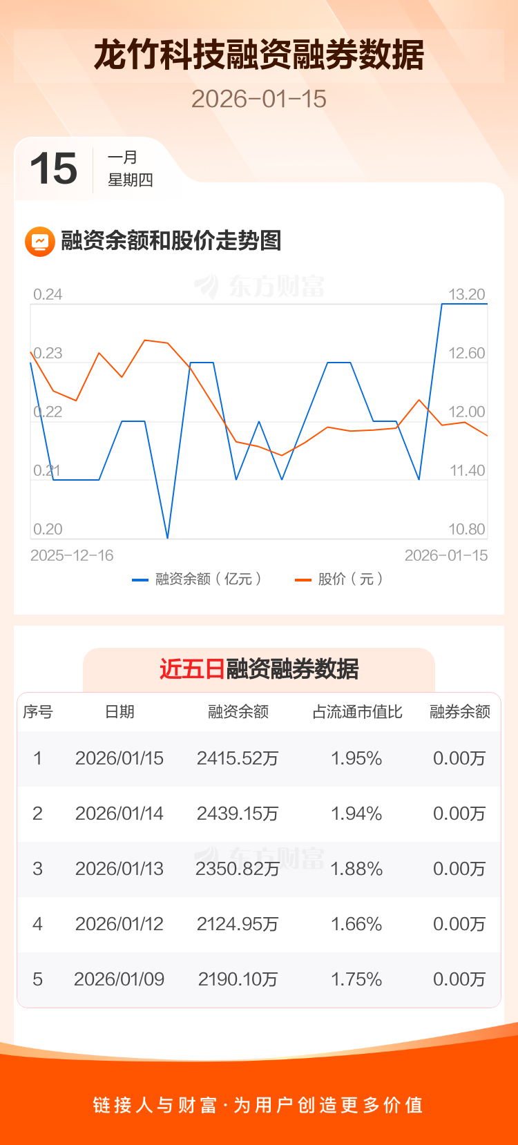 交易所最新数据显示,龙竹科技于2026年1月15日获融资买入224.76万元,融资偿还248.39万元,当日融资净偿还23.63万元。目前,该股融资余额2415.52万,占流通市值比例为1.95%。