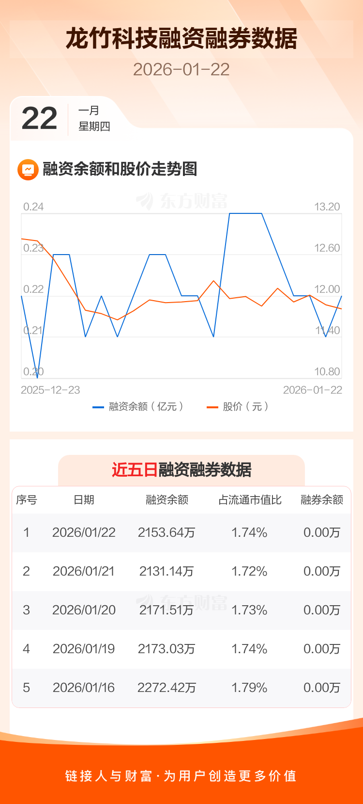 交易所最新数据显示,龙竹科技于2026年1月22日获融资买入151.92万元,融资偿还129.42万元,当日融资净买入22.5万元。目前,该股融资余额2153.64万,占流通市值比例为1.74%。