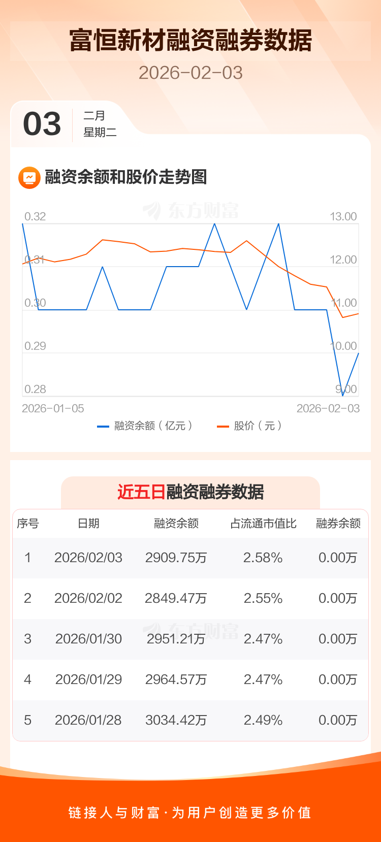 交易所最新数据显示,富恒新材于2026年2月3日获融资买入121.80万元,融资偿还61.53万元,当日融资净买入60.28万元。目前,该股融资余额2909.75万,占流通市值比例为2.58%。