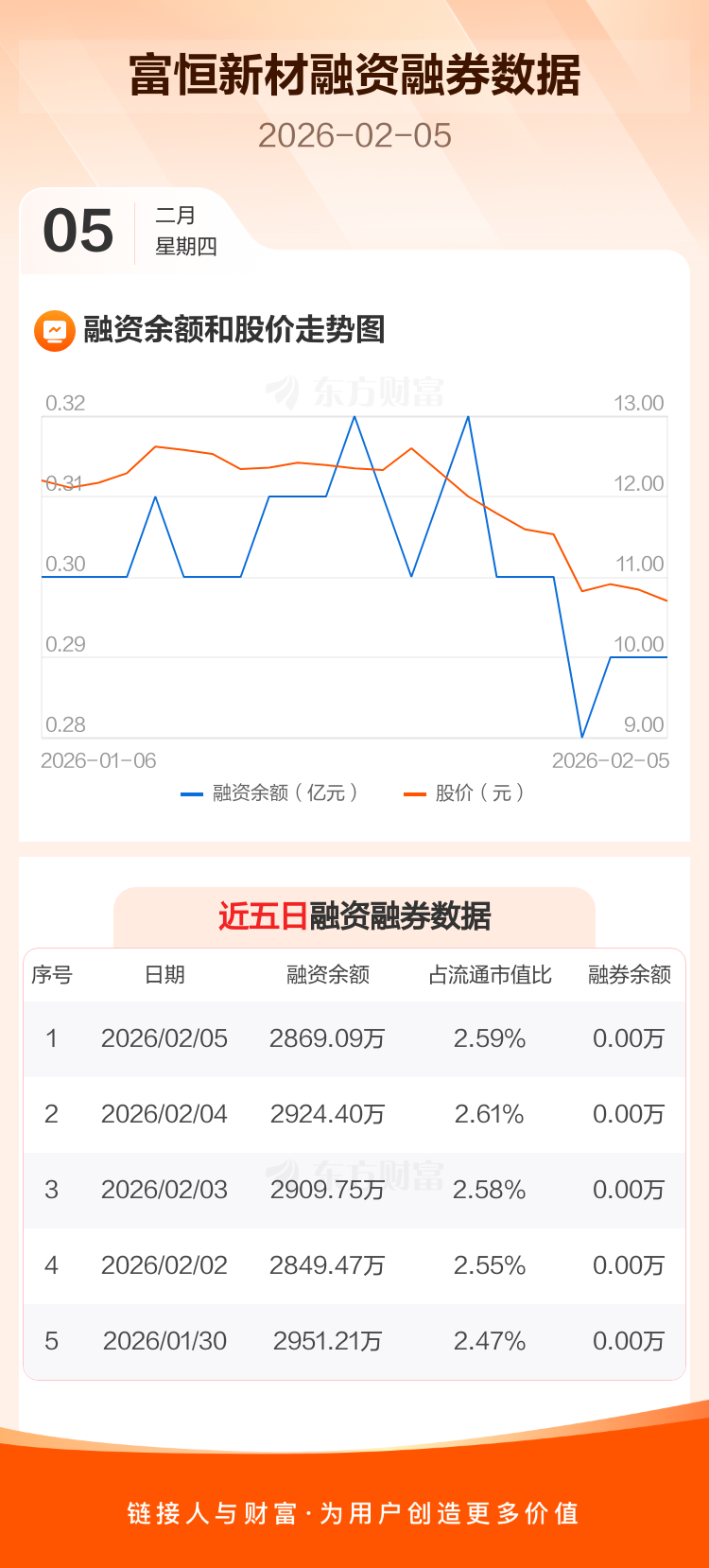 交易所最新数据显示,富恒新材于2026年2月5日获融资买入38.41万元,融资偿还93.73万元,当日融资净偿还55.32万元。目前,该股融资余额2869.09万,占流通市值比例为2.59%。