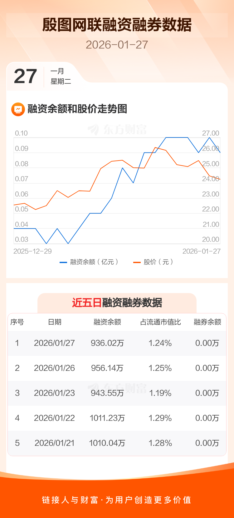 交易所最新数据显示,殷图网联于2026年1月27日获融资买入10.06万元,融资偿还30.18万元,当日融资净偿还20.12万元。目前,该股融资余额936.02万,占流通市值比例为1.24%。