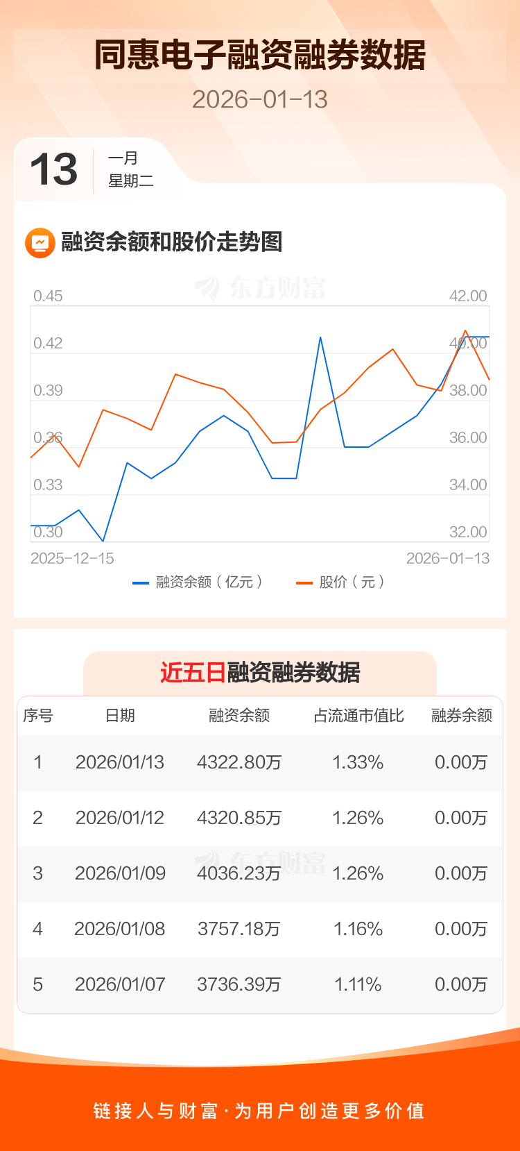 同惠电子:融资净买入1.95万元,融资余额4322.8万元