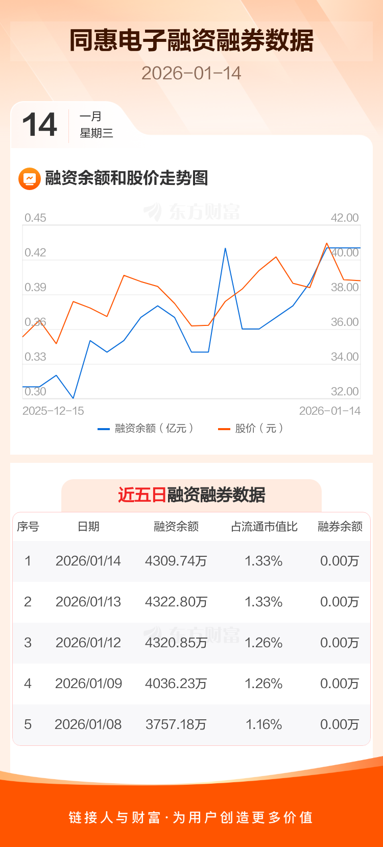 同惠电子:融资净偿还13.06万元,融资余额4309.74万元