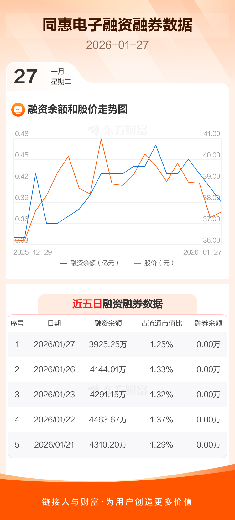 同惠电子:融资净偿还218.76万元,融资余额3925.25万元