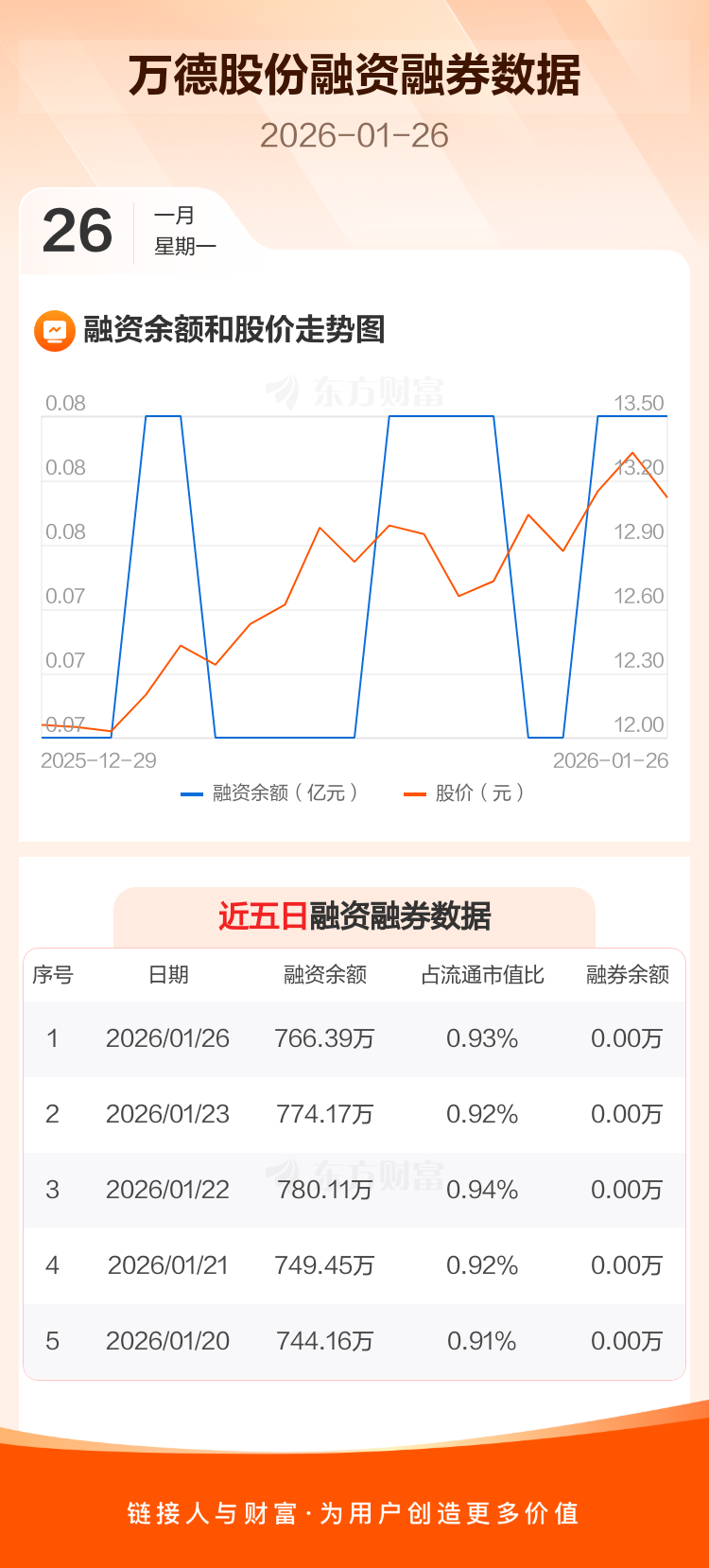 万德股份:融资净偿还7.78万元,融资余额766.39万元