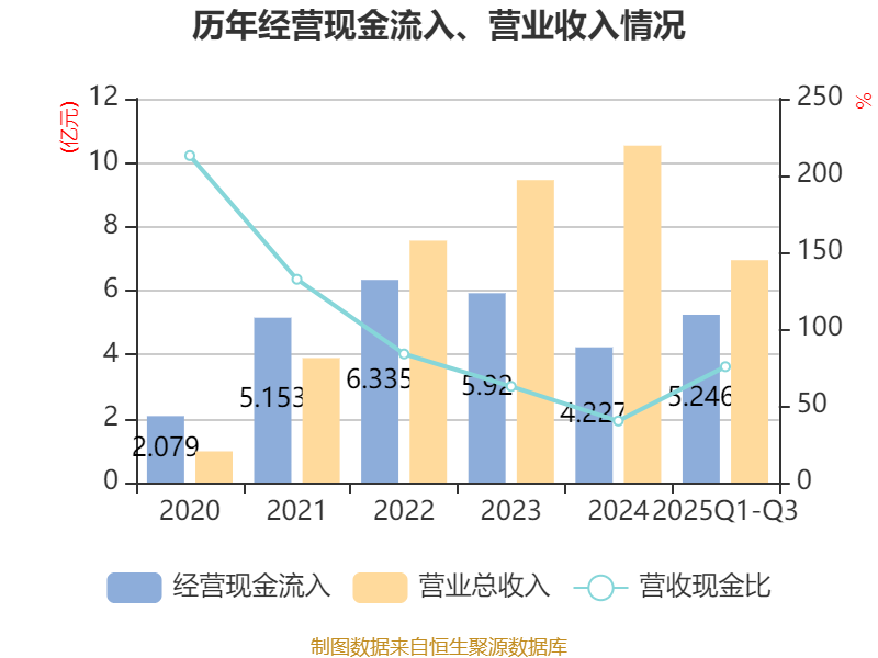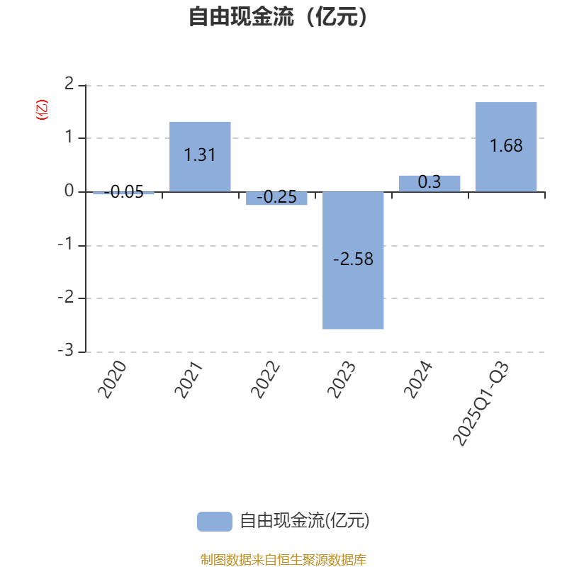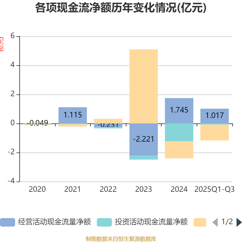 2025年前三季度,公司经营活动现金流净额为1.02亿元,同比下降15.5%;筹资活动现金流净额-1.1亿元,同比增加629.1万元;投资活动现金流净额-793.98万元,上年同期为-1.59亿元。