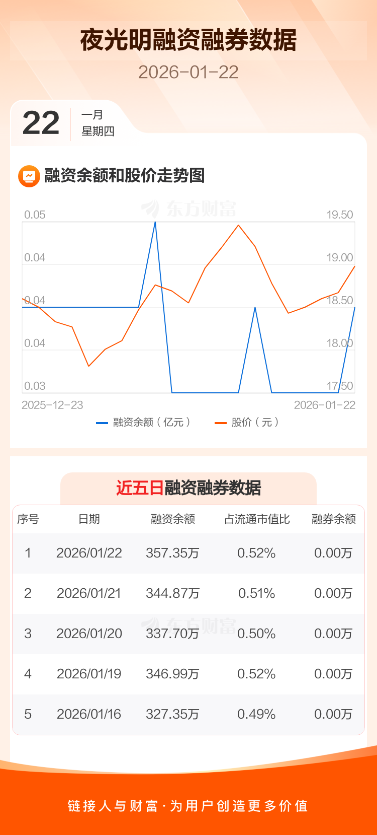 交易所最新数据显示,夜光明于2026年1月22日获融资买入35.53万元,融资偿还23.05万元,当日融资净买入12.48万元。目前,该股融资余额357.35万,占流通市值比例为0.52%。