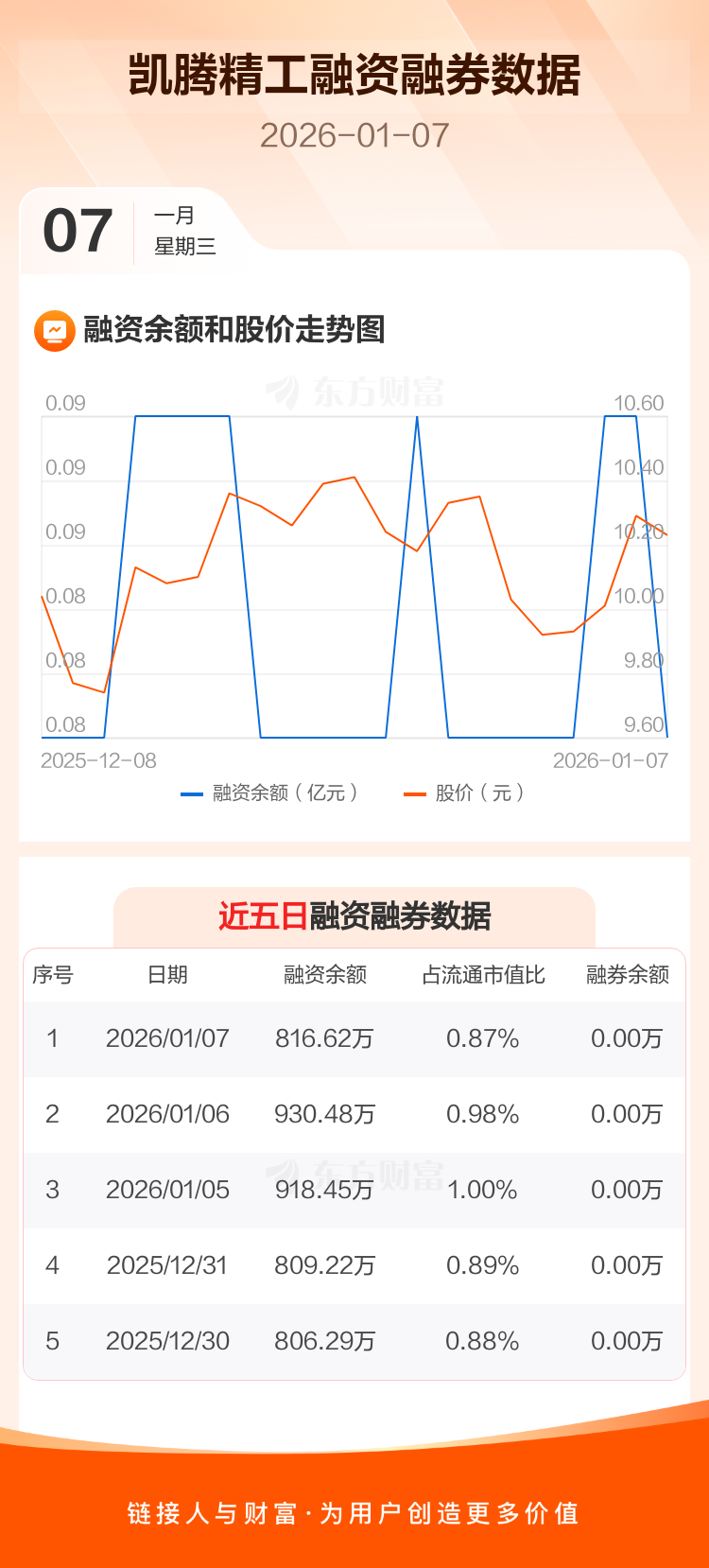 交易所最新数据显示,凯腾精工于2026年1月7日获融资买入140.81万元,融资偿还254.67万元,当日融资净偿还113.86万元。目前,该股融资余额816.62万,占流通市值比例为0.87%。