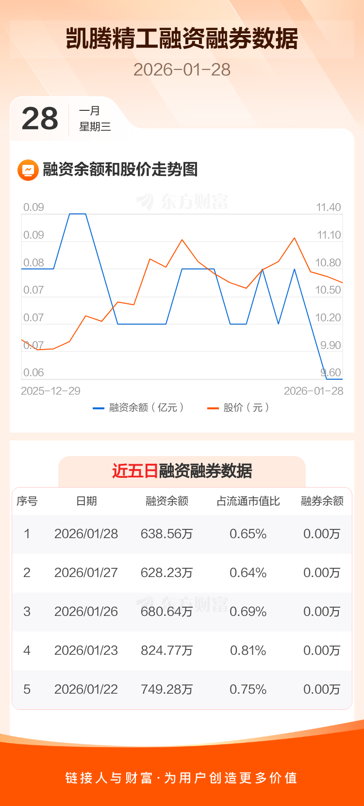 交易所最新数据显示,凯腾精工于2026年1月28日获融资买入87.39万元,融资偿还77.06万元,当日融资净买入10.33万元。目前,该股融资余额638.56万,占流通市值比例为0.65%。