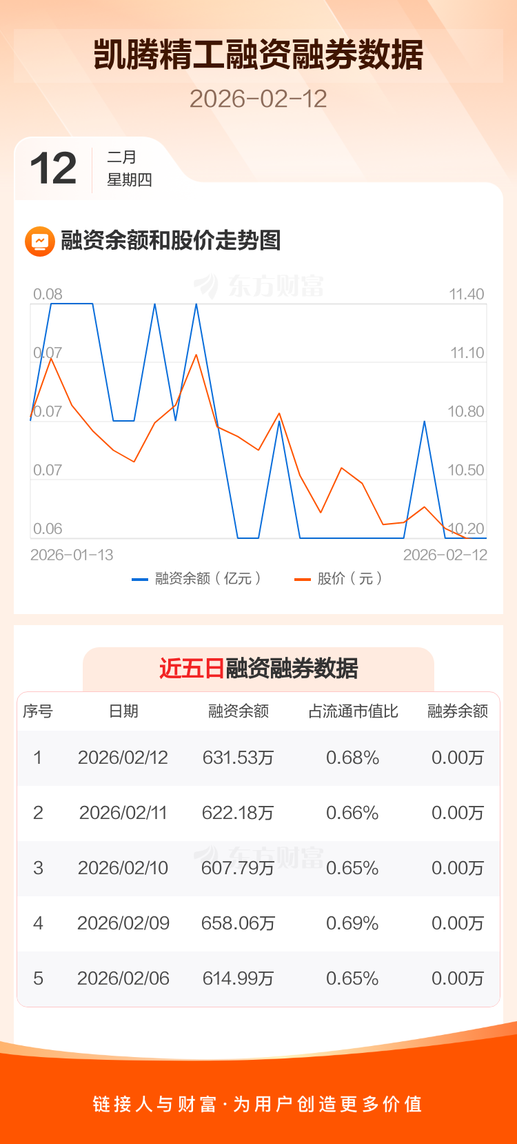 交易所最新数据显示,凯腾精工于2026年2月12日获融资买入76.36万元,融资偿还67.00万元,当日融资净买入9.36万元。目前,该股融资余额631.53万,占流通市值比例为0.68%。