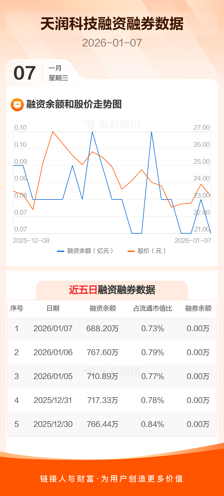 交易所最新数据显示,天润科技于2026年1月7日获融资买入80.28万元,融资偿还159.68万元,当日融资净偿还79.4万元。目前,该股融资余额688.20万,占流通市值比例为0.73%。