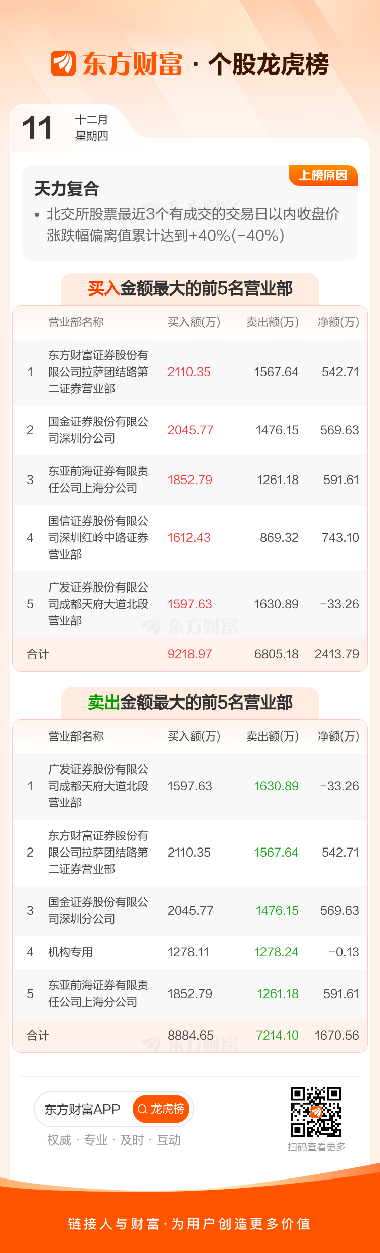 交易所2025年12月11日公布的交易公开信息显示,天力复合因成为当日价格振幅达到30%的前5只股票、当日收盘价涨幅达到20%的前5只股票、北交所股票最近3个有成交的交易日以内收盘价涨跌幅偏离值累计达到+40%(-40%)上榜。天力复合当日收报46.8元,涨跌幅30.00%,偏离值33.87%,换手率10.67%,成交额4.64亿。异常期间12月9日至12月11日,期间涨幅43.12%,累计偏离值41.93%,区间成交额10.50亿。