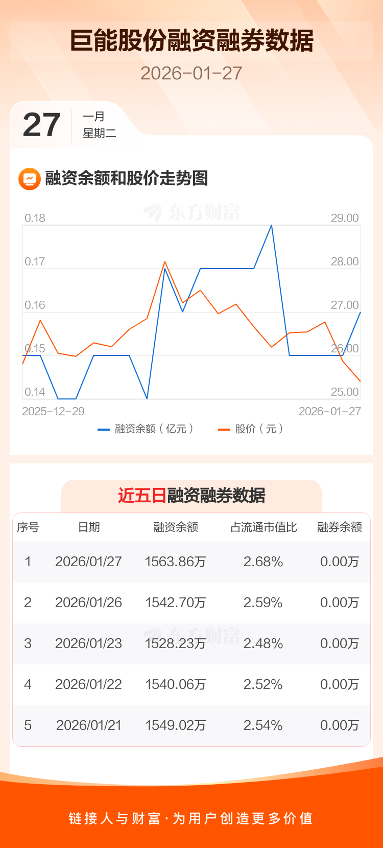 交易所最新数据显示,巨能股份于2026年1月27日获融资买入70.78万元,融资偿还49.62万元,当日融资净买入21.17万元。目前,该股融资余额1563.86万,占流通市值比例为2.68%。