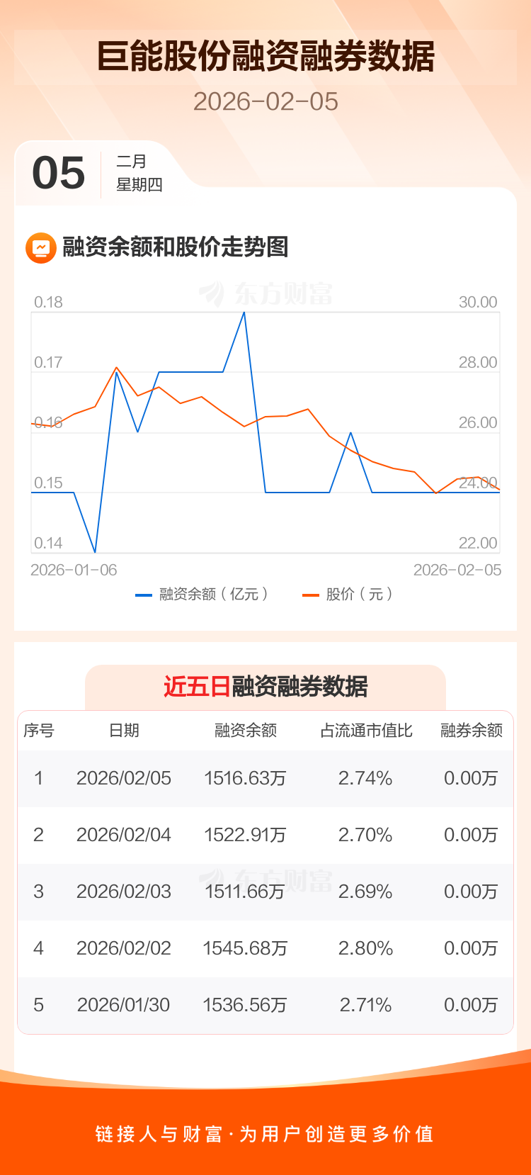 交易所最新数据显示,巨能股份于2026年2月5日获融资买入10.56万元,融资偿还16.84万元,当日融资净偿还6.28万元。目前,该股融资余额1516.63万,占流通市值比例为2.74%。