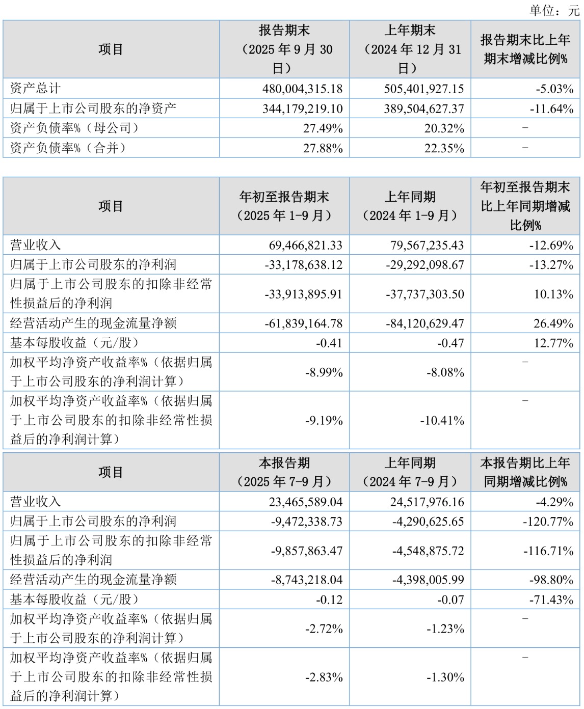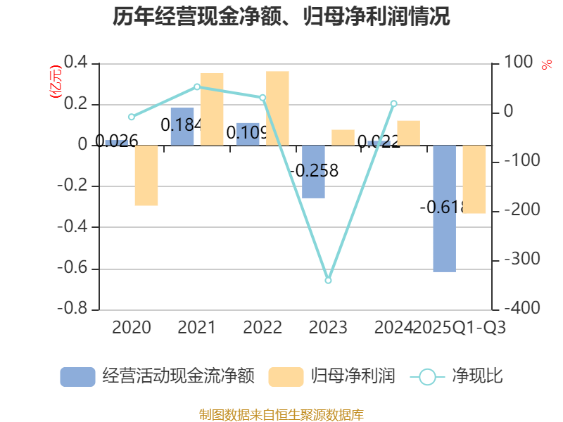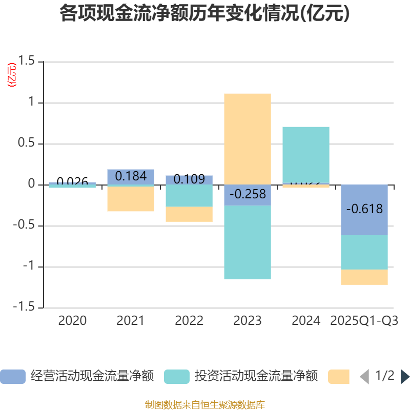 2025年前三季度,公司经营活动现金流净额为-6183.92万元,同比增加2228.15万元;筹资活动现金流净额-1871.66万元,同比减少1409.51万元;投资活动现金流净额-4190.85万元,上年同期为5041.13万元。