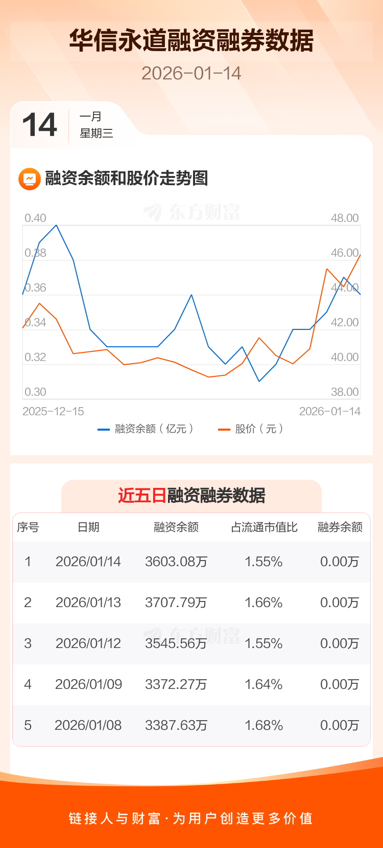交易所最新数据显示,华信永道于2026年1月14日获融资买入2165.09万元,融资偿还2269.79万元,当日融资净偿还104.71万元。目前,该股融资余额3603.08万,占流通市值比例为1.55%。