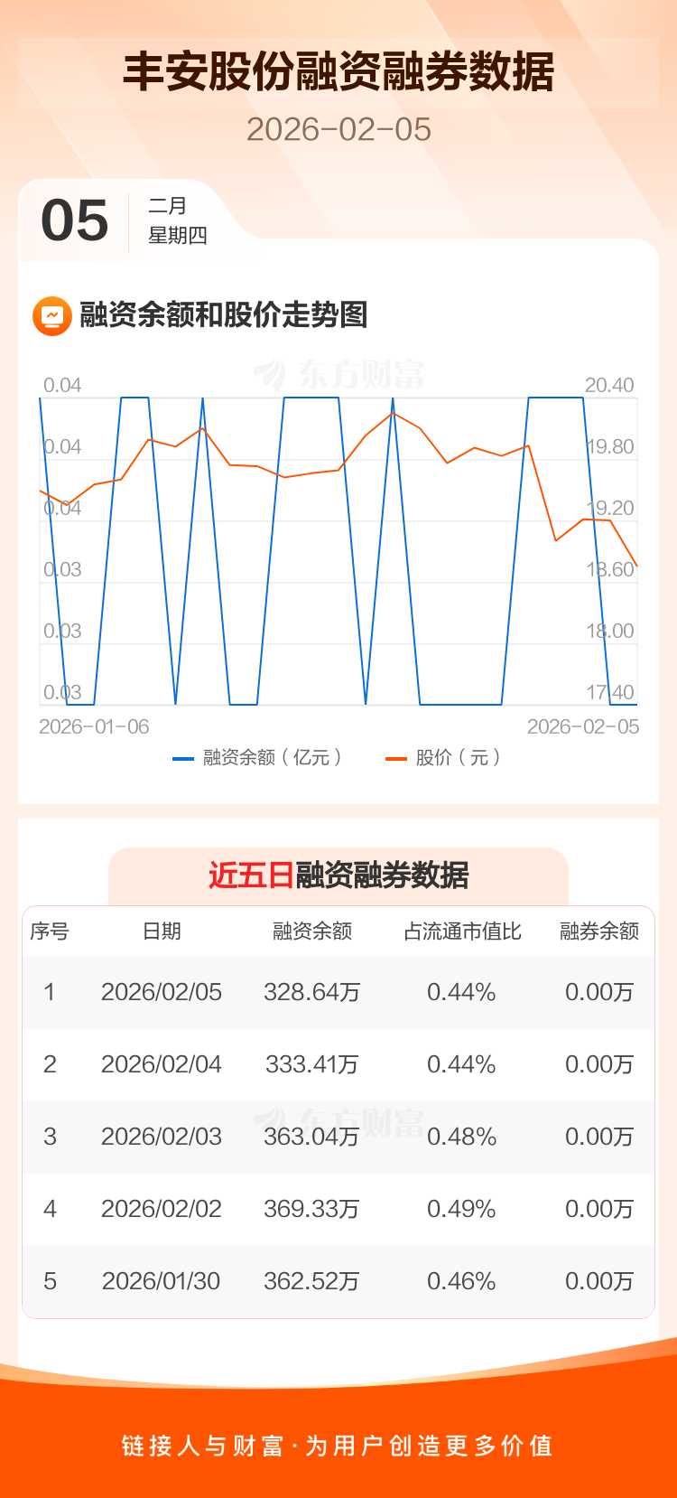 交易所最新数据显示,丰安股份于2026年2月5日获融资买入15.62万元,融资偿还20.40万元,当日融资净偿还4.77万元。目前,该股融资余额328.64万,占流通市值比例为0.44%。